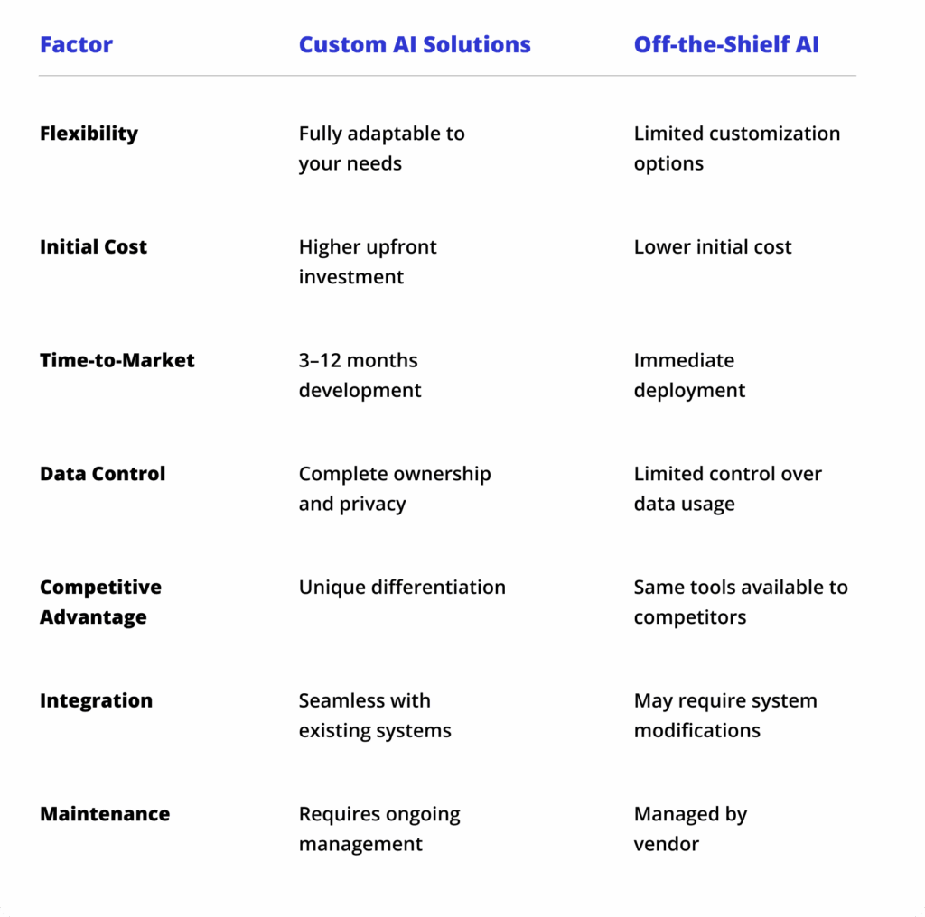 With 92% of companies planning to invest in Gen AI in 2025, custom AI capabilities have become essential for businesses seeking a competitive advantage or facing unique challenges. Whether it’s analyzing proprietary datasets, integrating with legacy systems, or meeting industry-specific compliance requirements, tailor-made AI solutions provide the precision and flexibility that off-the-shelf solutions lack. That being said, each type of AI solution has strategic advantages and tradeoffs that businesses need to consider when planning strategic adoption.