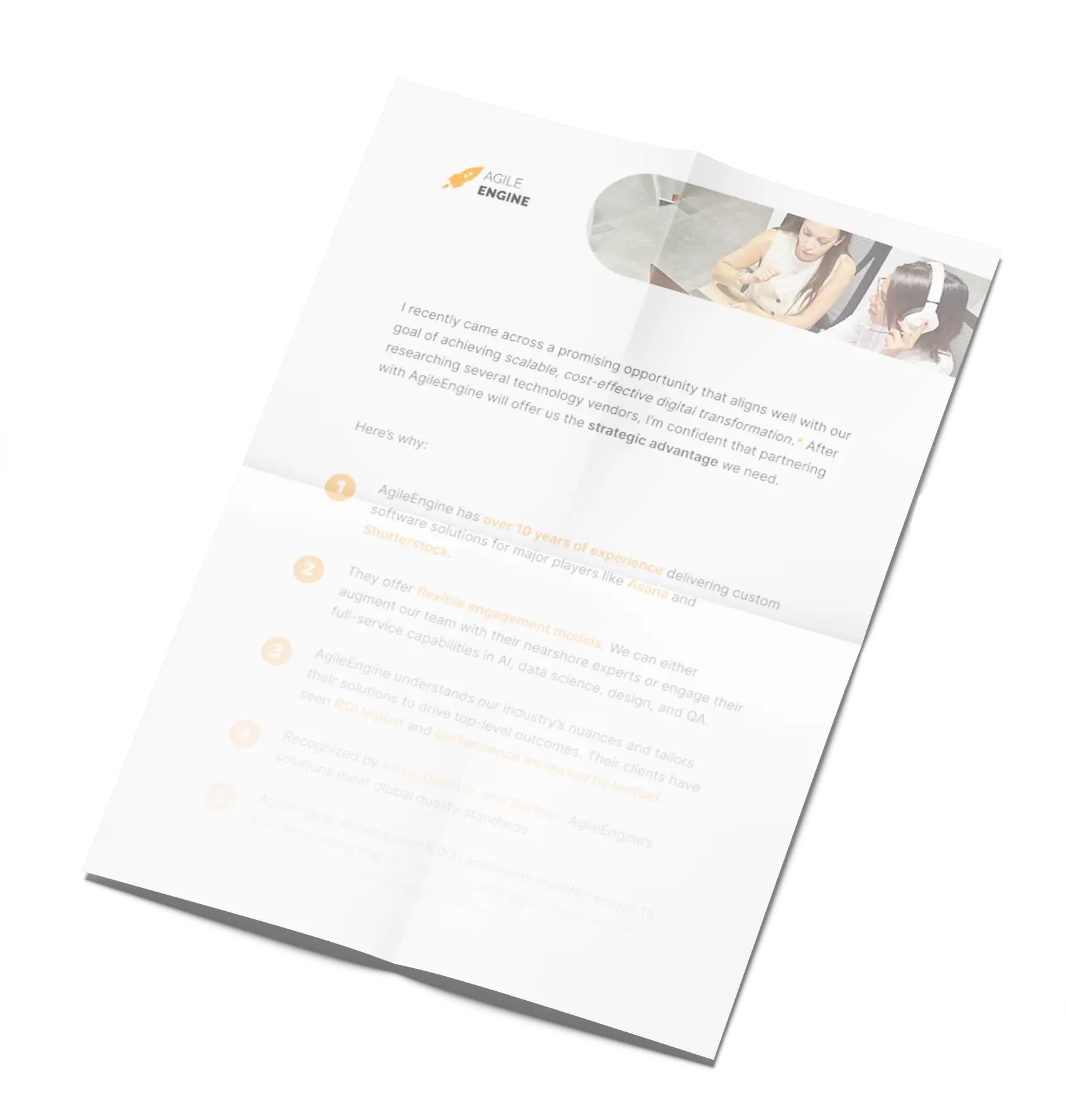 With over a decade of experience building custom software for global leaders like Asana and Shutterstock, AgileEngine has a proven track record of delivering high-impact solutions. Our template outlines the key differentiators that set us apart, from our award-winning expertise to our flexible engagement models.